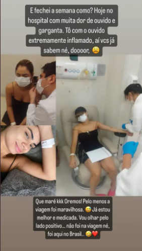 “E fechei a semana como? Hoje no hospital, com muita dor de ouvido e garganta. Estou com o ouvido extremamente inflamado. Aí vocês já sabem. Dor”, escreveu a cantora.