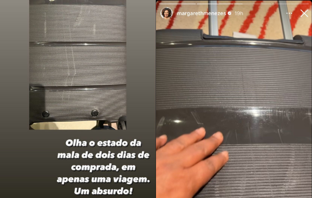 Margareth ainda continuou mostrando o estado da mala. “Parece que arranharam de propósito. Que coisa absurda, é um arranhão estranho”.