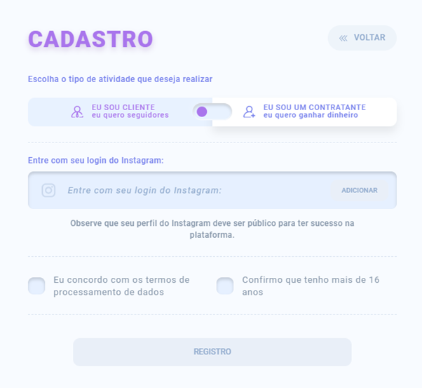 Selecione o tipo de atividade “Cliente”, digite seu nome de usuário do Instagram e espere até que o sistema o encontre. Depois disso, marque as caixas para concordar com o processamento de dados e clique em “Cadastre-se”.