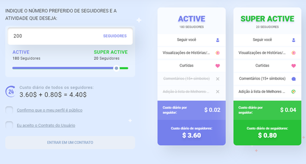 Especifique o número desejado de assinantes e mova o controle deslizante para ajustar o número de assinantes ativos e superativos. O programa calculará automaticamente o custo do serviço. Se estiver satisfeito com tudo, aceite o Contrato de Usuário e clique em “Concluir contrato”.