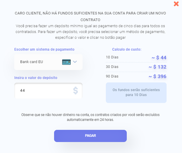 Agora você precisa recarregar o saldo da sua conta e fazer um depósito. O pagamento mínimo é calculado com base no fato de que os assinantes são recrutados de forma gradual e não da noite para o dia. À direita estão as opções de valor de recarga.