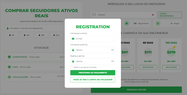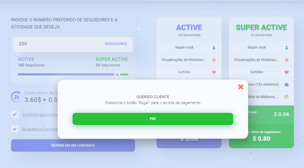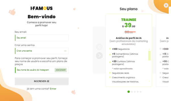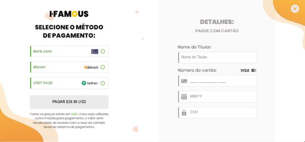 A compra de uma tarifa de pacote é uma compra única. I-Famous não coleta informações de pagamento nem impõe taxas ocultas. Portanto, você pode ter certeza de sua absoluta honestidade e confiabilidade.