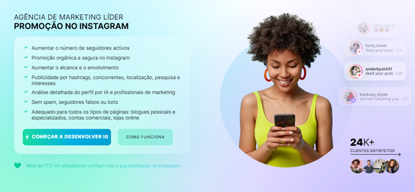 - Segurança e transparência. O serviço utiliza métodos de promoção de contas de chapéu branco, portanto não há risco de bloqueio. Os assinantes e suas atividades crescem sem problemas, sem atrair atenção desnecessária do sistema de segurança do Instagram.
