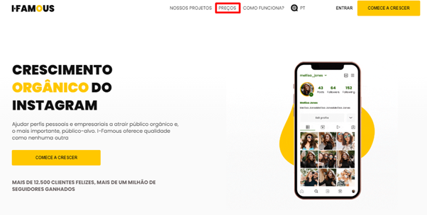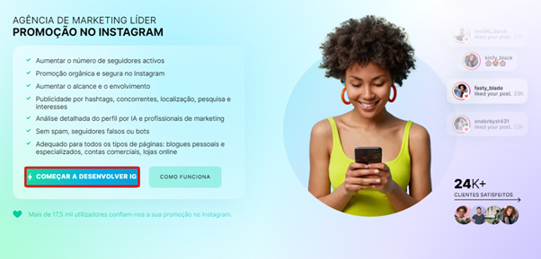 Acesse o site da Zamupa. Clique em “Começar a crescer o Instagram”.