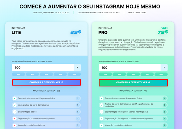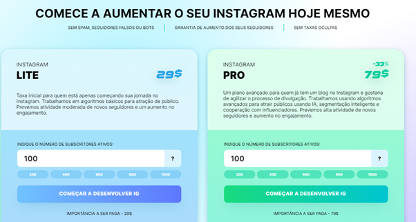 O serviço oferece duas tarifas à sua escolha. O tarifário LITE destina-se a quem só recentemente começou a desenvolver-se no Instagram. O trabalho utiliza métodos básicos de atração de público-alvo com base em informações de perfil. Novos seguidores irão se inscrever, visualizar postagens e também curtir.