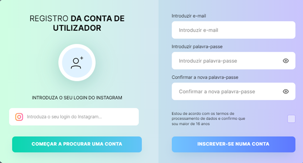 Cadastre-se na plataforma. Primeiro, digite seu nome de usuário do Instagram e clique em “Começar a procurar uma conta”. Depois disso, digite seu e-mail, senha e aceite o Contrato do Usuário.