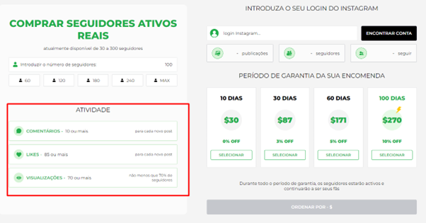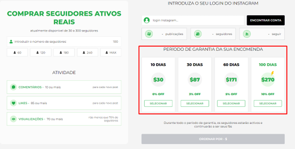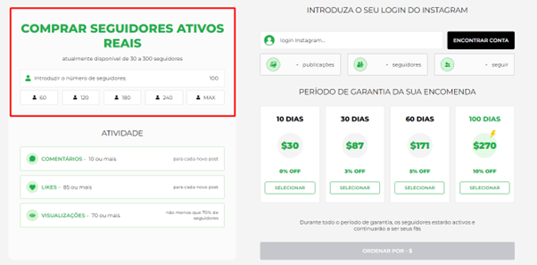 Na próxima página vemos uma calculadora de serviço. Indique quantos seguidores você deseja comprar.