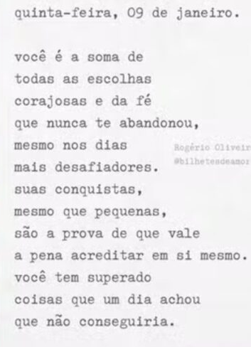 "Você é a soma de todas as escolhas corajosas e da fé que nunca te abandonou, mesmo nos dias mais desafiadores. Suas conquistas, mesmo que pequenas, são a prova de que vale a pena acreditar em si mesmo. Você tem superado coisas que um dia achou que não conseguiria."