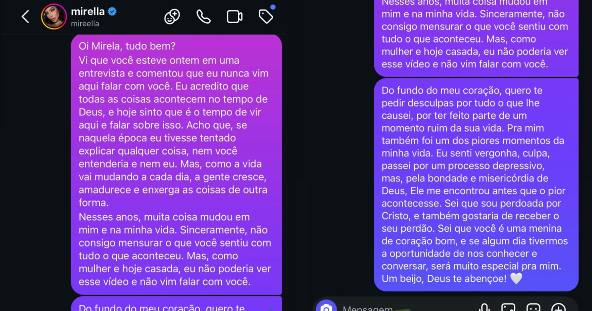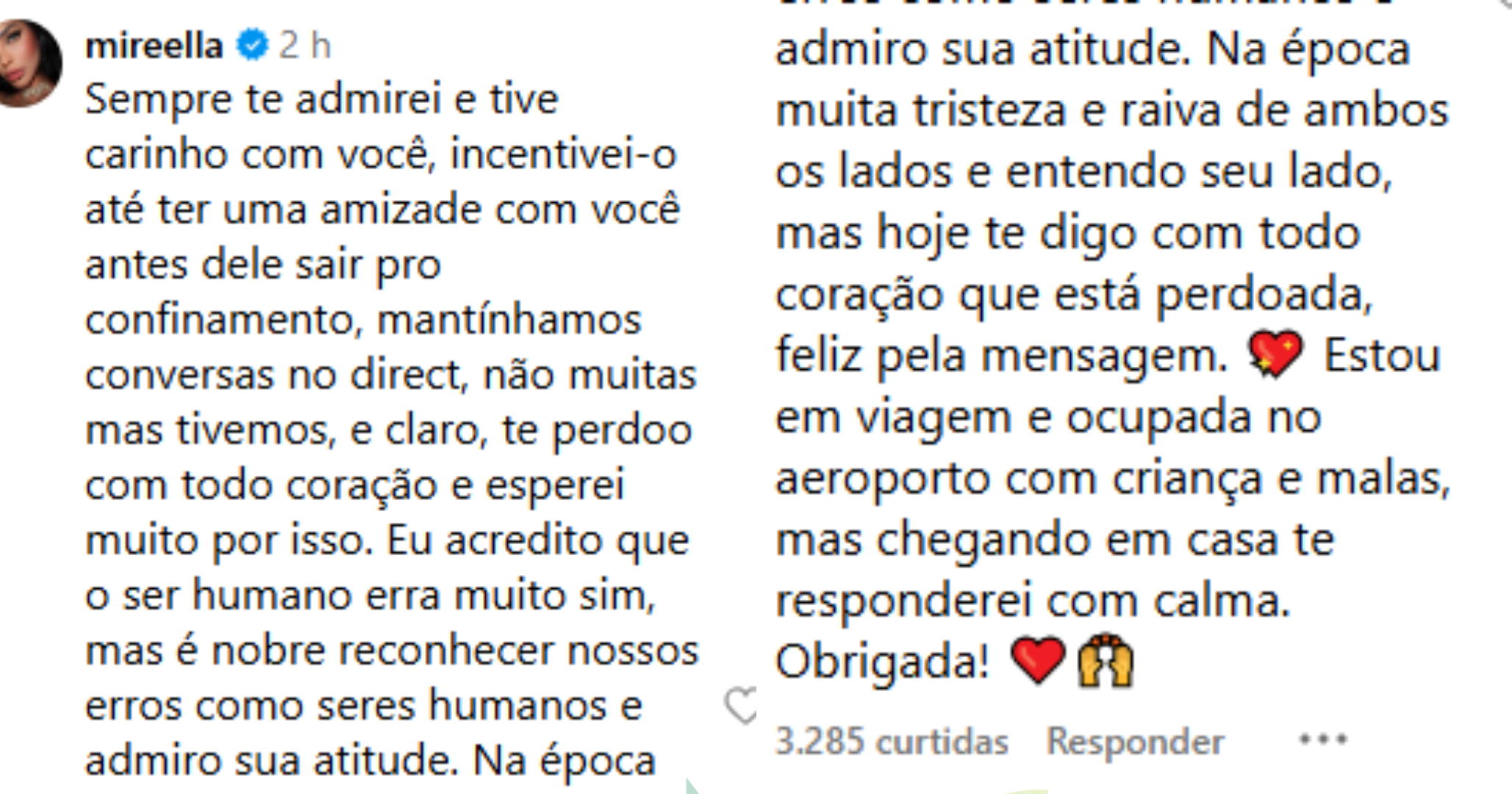 Nesta quarta, em resposta a uma página de fofoca, a MC Mirella comentou o pedido de desculpas de Sthe: “Sempre te admirei e tive carinho com você, incentivei-o até ter uma amizade com você antes dele sair pro confinamento, mantínhamos conversas no direct, não muitas mas tivemos, e claro, te perdoo com todo coração e esperei muito por isso. Eu acredito que o ser humano erra muito sim, mas é nobre reconhecer nossos erros como seres humanos e admiro sua atitude. Na época muita tristeza e raiva de ambos os lados e entendo seu lado, mas hoje te digo com todo coração que está perdoada, feliz pela mensagem. ???? Estou em viagem e ocupada no aeroporto com criança e malas, mas chegando em casa te responderei com calma. Obrigada! ??????”
