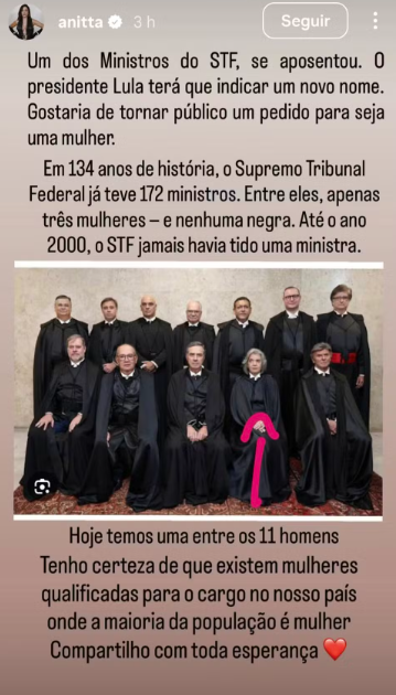 "Um dos Ministros do STF, se aposentou. O presidente Lula terá que indicar um novo nome. Gostaria de tornar público um pedido para seja uma mulher. Em 134 anos de história, o Supremo Tribunal Federal já teve 172 ministros. Entre eles, apenas três mulheres - e nenhuma negra. Até o ano 2000, o STF jamais havia tido uma ministra", escreveu a artista.