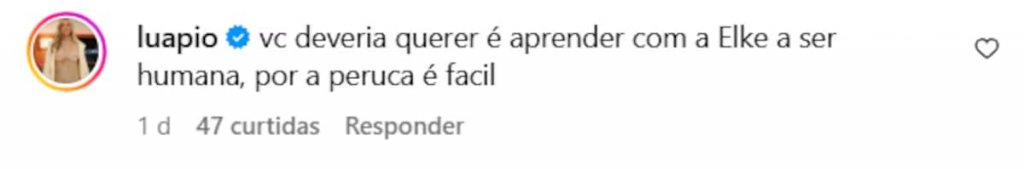 A crítica foi deixada em forma de comentário, em uma publicação do portal Splash, no Instagram, que apresentava mais detalhes sobre a fantasia de Bianca. “Você deveria querer é aprender com a Elke a ser humana, por a peruca é facil”, escreveu Piovani.