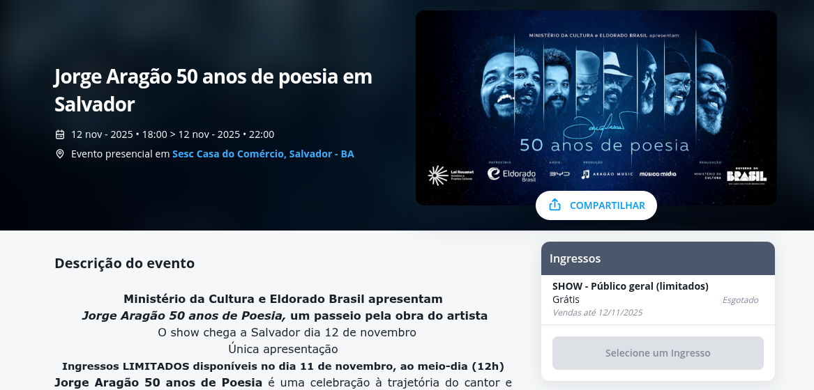 Não deu para quem quis. Salvador recebe nesta quarta-feira (12) o espetáculo Jorge Aragão 50 anos de Poesia, uma celebração à trajetória do cantor e compositor carioca, ícone do samba, e os ingressos para o show gratuito esgotaram em menos de 2 minutos de venda.