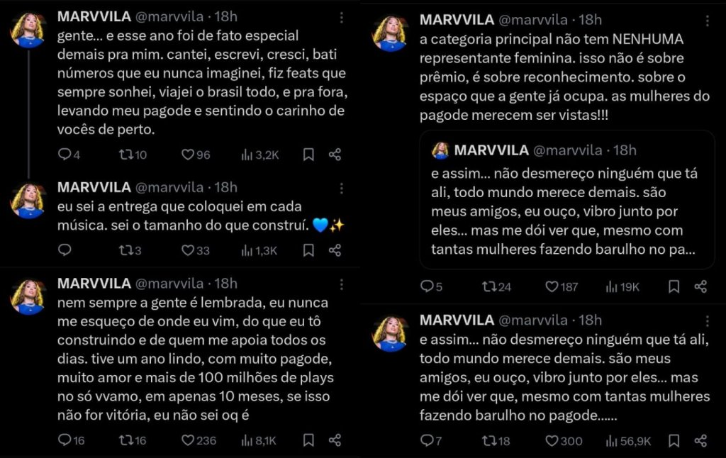 Aos seguidores, Marvvila defendeu o reconhecimento e visibilidade para mulheres da cena. “A categoria principal não tem nenhuma representante feminina. Isso não é sobre prêmio, é sobre reconhecimento. Sobre o espaço que a gente já ocupa. As mulheres do pagode merecem ser vistas”, completou.