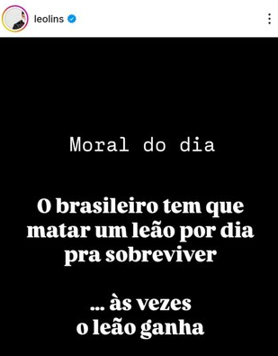 Em uma postagem feita no Instagram, Lins compartilhou a frase: "Moral do dia: o brasileiro tem que matar um leão por dia para sobreviver... às vezes, o leão ganha".