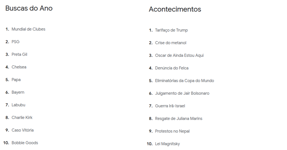 Na lista de acontecimentos, o Oscar de Ainda Estou Aqui aparece em terceiro lugar nas buscas do público. Outro tópico que envolve a área de entretenimento pelas pessoas envolvidas é a Denúncia do Felca, um vídeo feito pelo youtuber que colaborou para a prisão de Hytalo Santos.