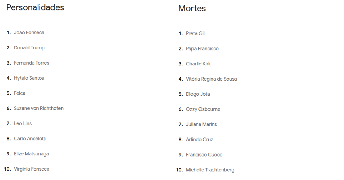 Entre as personalidades mais buscadas estão Fernanda Torres, em terceiro lugar, Hytalo Santos em quarto, Felca em quinto, Suzane von Ritchthofen em sexto, Léo Lins em sétimo, Elize Matsunaga em nono lugar e Virgínia Fonseca em décimo.
