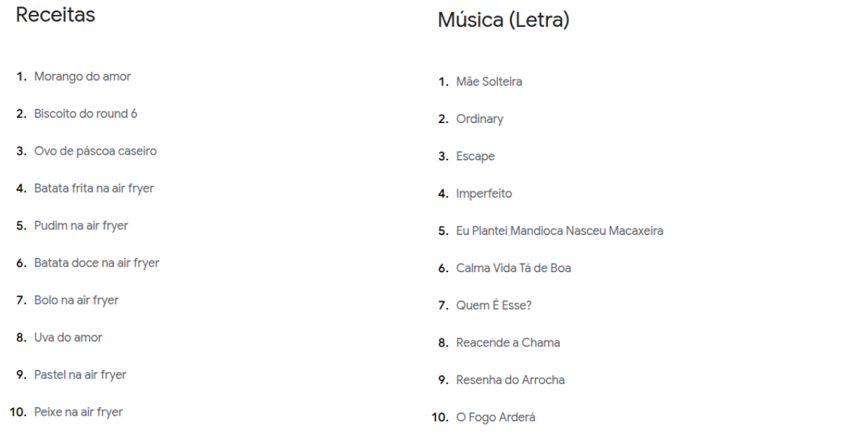 A plataforma divulgou na última quinta-feira (4), a retrospectiva que indica as principais buscas dos brasileiros no Google com alguns termos, como o "Quanto custa?", "Quem é?", "Por que?" e "O que é?", além das trends, músicas, shows, receitas, personalidades, TVs e séries e filmes.