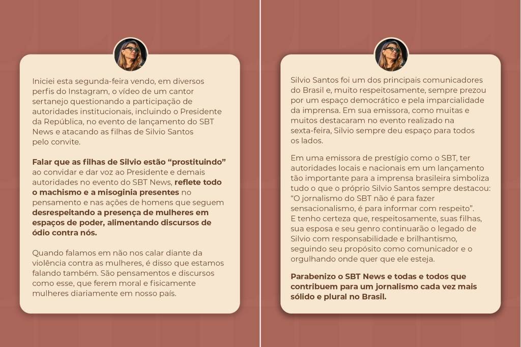 Sem citar o nome do artista, a primeira-dama apontou que “falar que as filhas de Silvio estão ‘prostituindo’ ao convidar e dar voz ao Presidente e demais autoridades no evento do SBT News, reflete todo o machismo e a misoginia presentes no pensamento e nas ações de homens que seguem desrespeitando a presença de mulheres em espaços de poder”.