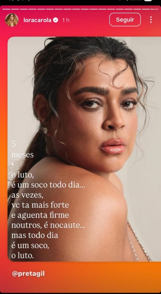 Na publicação, a artista desabafou sobre o luto que vem passando desde o falecimento da cantora, filha de Gilberto Gil. “5 meses. O luto é um soco todo dia. Às vezes você está mais forte e aguenta firme. Noutros é nocaute… Mas todo dia é um soco, o luto”, escreveu.