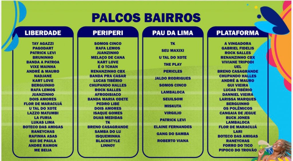 Já pra quem vai curtir o Carnaval e Pau da Lima ou em outros bairros de Salvador, como Cajazeiras, Liberdade, Periperi, Boca do Rio, Plataforma e Itapuã, poderá aproveitar shows de Pagod’art, Timbalada, Dan Valente, Robson Morais, Buck Jones, Uel e mais.