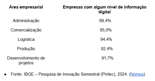 Esse cenário se insere em um processo mais amplo de transformação digital nas empresas brasileiras. Segundo a Pesquisa de Inovação (Pintec) do IBGE, mais de 90% das empresas industriais no país já utilizam algum tipo de informação digital em suas atividades administrativas ou operacionais. (Agência de Notícias - IBGE)