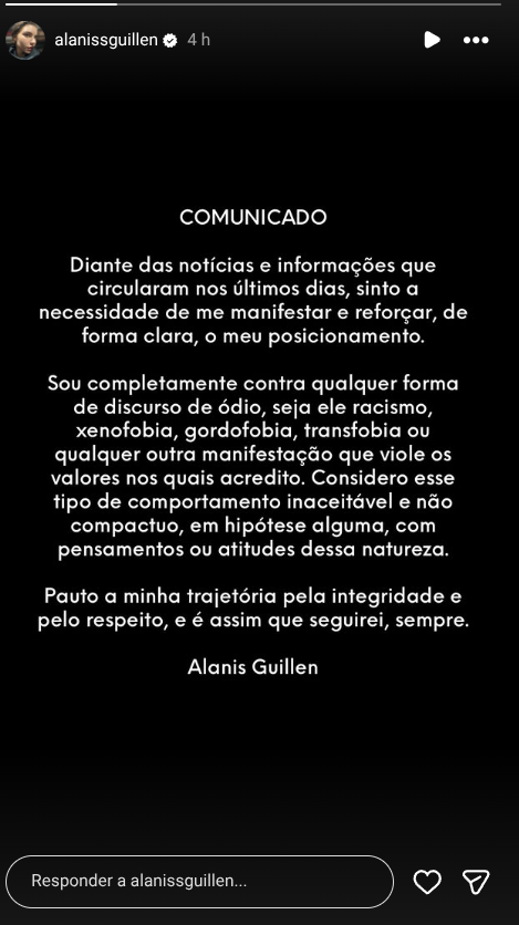 Em suas redes sociais, Alanis afirmou ser “completamente contra qualquer forma de discurso de ódio, seja ele racismo, xenofobia, gordofobia, transfobia ou qualquer outra manifestação que viole os valores” nos quais acredita e que considera o comportamento “inaceitável”.