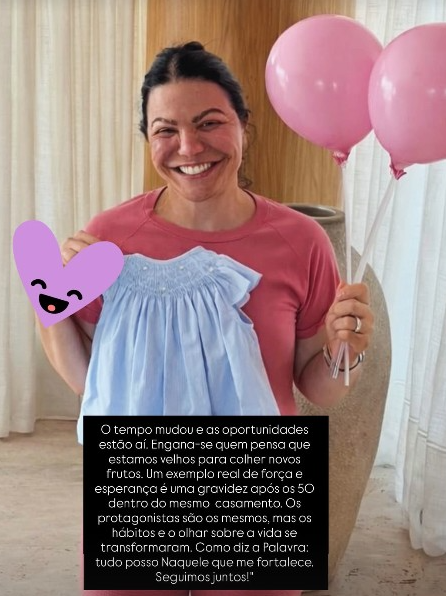 "Um exemplo real de força e esperança é uma gravidez após os 50 dentro do mesmo casamento. Os protagonistas são os mesmos, mas os hábitos e o olhar sobre a vida se transformaram. Como diz a Palavra: tudo posso Naquele que me fortalece. Seguimos juntos!", escreveu a matriarca da família.