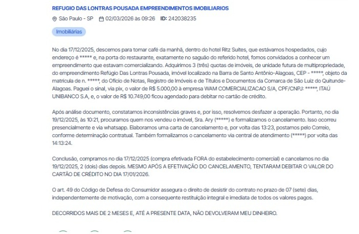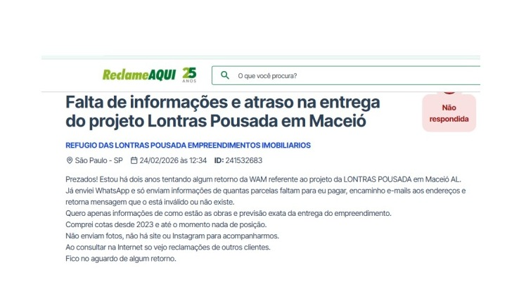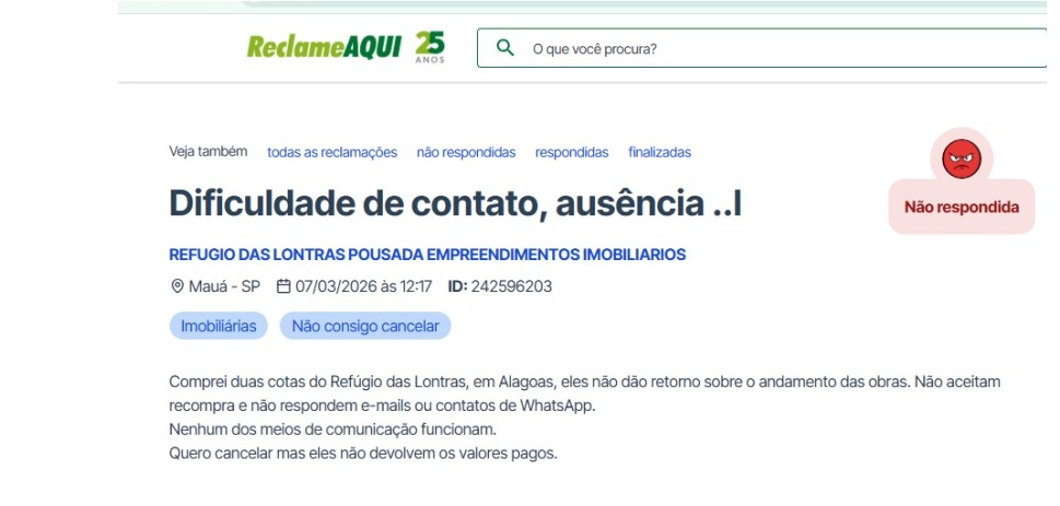 O Bahia Notícias consultou o site “Reclame Aqui” e encontrou mais de 60 relatos de clientes que reclamaram de uma “demora” para a realização dos estornos das cotas do Refúgio das Lontras. Nos comentários, os clientes alegam uma situação similar, tendo solicitado o distrato dentro do prazo legal do CDC, mas que as cobranças teriam continuado da mesma forma. Além disso, há relatos de pessoas que realizaram a compra em 2023, mas seguem sem retorno sobre a atualização das obras na capital alagoana.