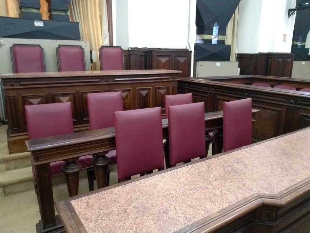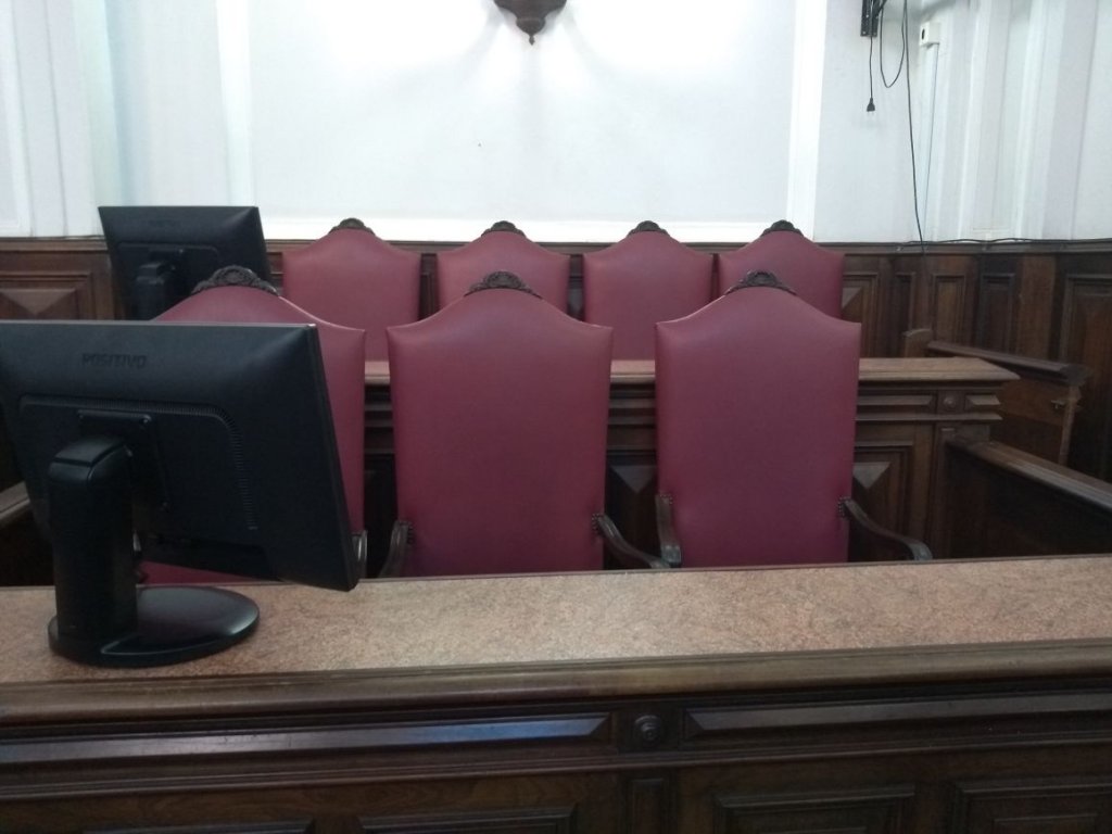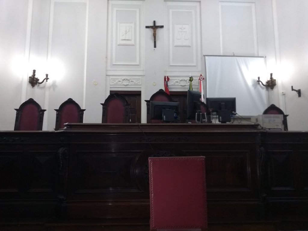 Disposição do Júri: Ao centro do Salão do Júri, é localizada a mesa principal, onde tem assento a juíza presidente da sessão. À direita, está o assento do Ministério Público, e à esquerda, servidores da Vara. Mais abaixo, à direita, está localizado o Conselho de Sentenças, e à esquerda, a bancada da defesa.