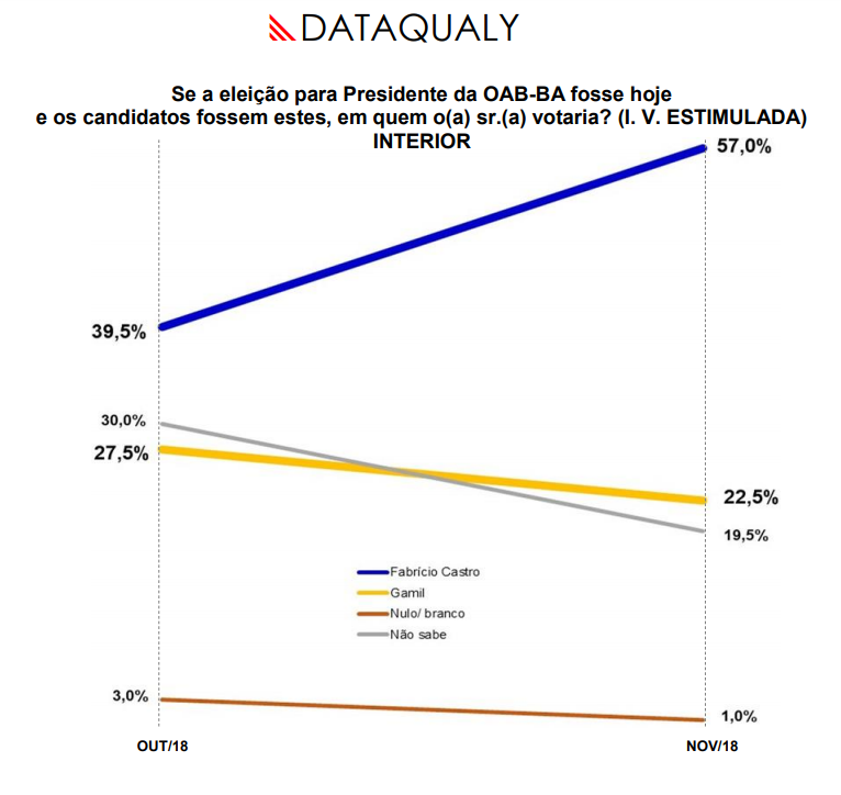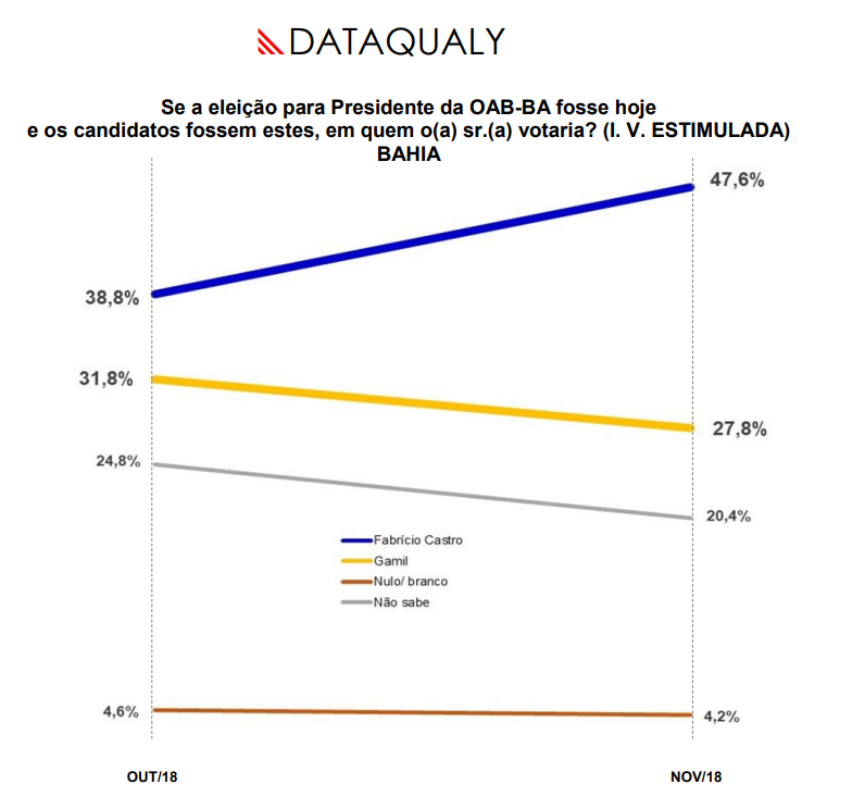 O conselheiro federal da Ordem dos Advogados do Brasil (OAB), Fabrício Castro, ampliou a vantagem frente ao seu concorrente na corrida eleitoral pela presidência da seção Bahia da entidade. De acordo com o levantamento contratado pelo Bahia Notícias junto ao Instituto Dataqualy, Castro cresceu de 38,8% das intenções de voto, em outubro (relembre aqui), para 47,6% neste mês. A pesquisa ouviu 500 advogados entre os dias 6 e 9 de novembro de 2018, na capital e no interior do estado.A margem de erro é de 4,4 pontos para mais ou para menos, com um intervalo de confiança de 95%. A eleição está marcada para o próximo dia 21 de novembro.