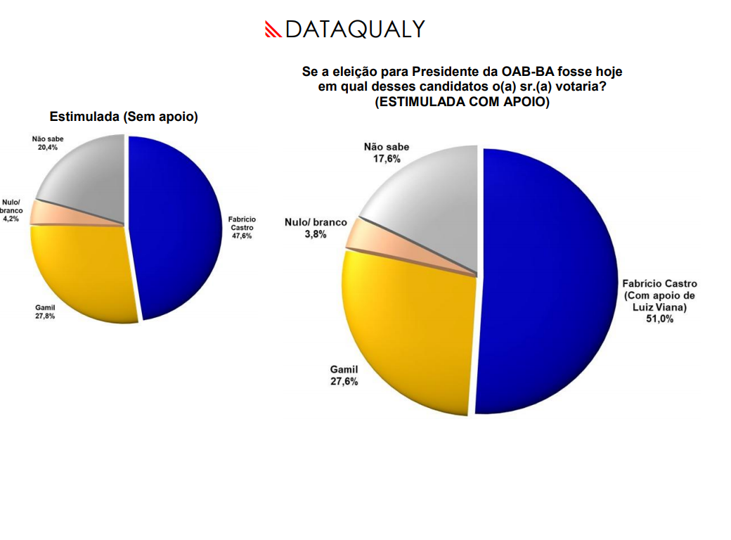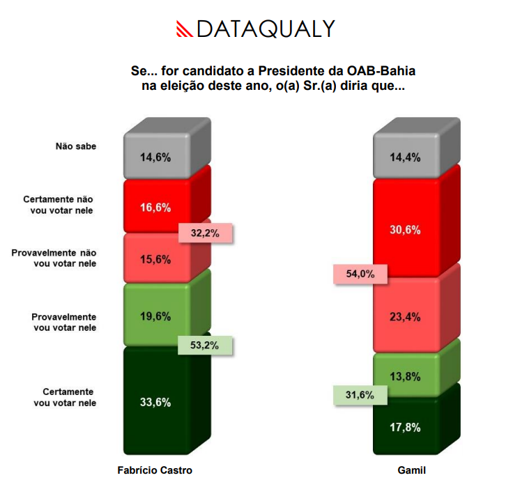 Ao apresentar os nomes dos dois candidatos à presidência da OAB-BA, o Dataqualy questionou em quem o advogado "certamente não vai votar" ou "provavelmente não vai votar" (o que representaria uma rejeição) ou em quem "provavelmente vai votar" ou "certamente vai votar" (ou que demonstra apoio). Nesse caso, a "rejeição" ao nome de Gamil fica em 54%, enquanto a "rejeição" a Fabrício está em 32,2%. Já em relação aos números que indicam provável apoio, Fabrício aparece com 53,2% das respostas positivas, enquanto Gamil tem 31,6%.