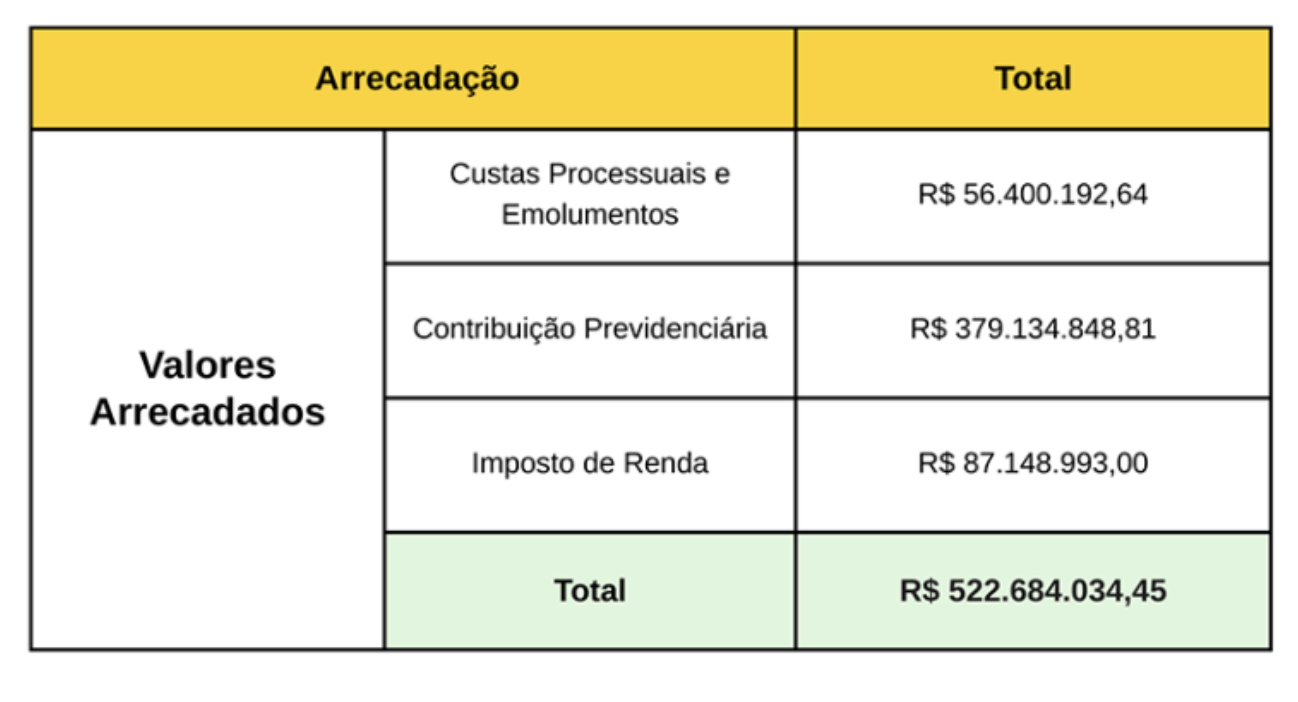 No período, a Justiça do Trabalho na Bahia arrecadou R$ 522,6 milhões. Desse total, R$ 379,1 milhões correspondem à contribuição previdenciária, R$ 87,1 milhões ao Imposto de Renda e R$ 56,4 milhões a custas processuais e emolumentos. Em 2024, a arrecadação havia alcançado R$ 500,3 milhões.