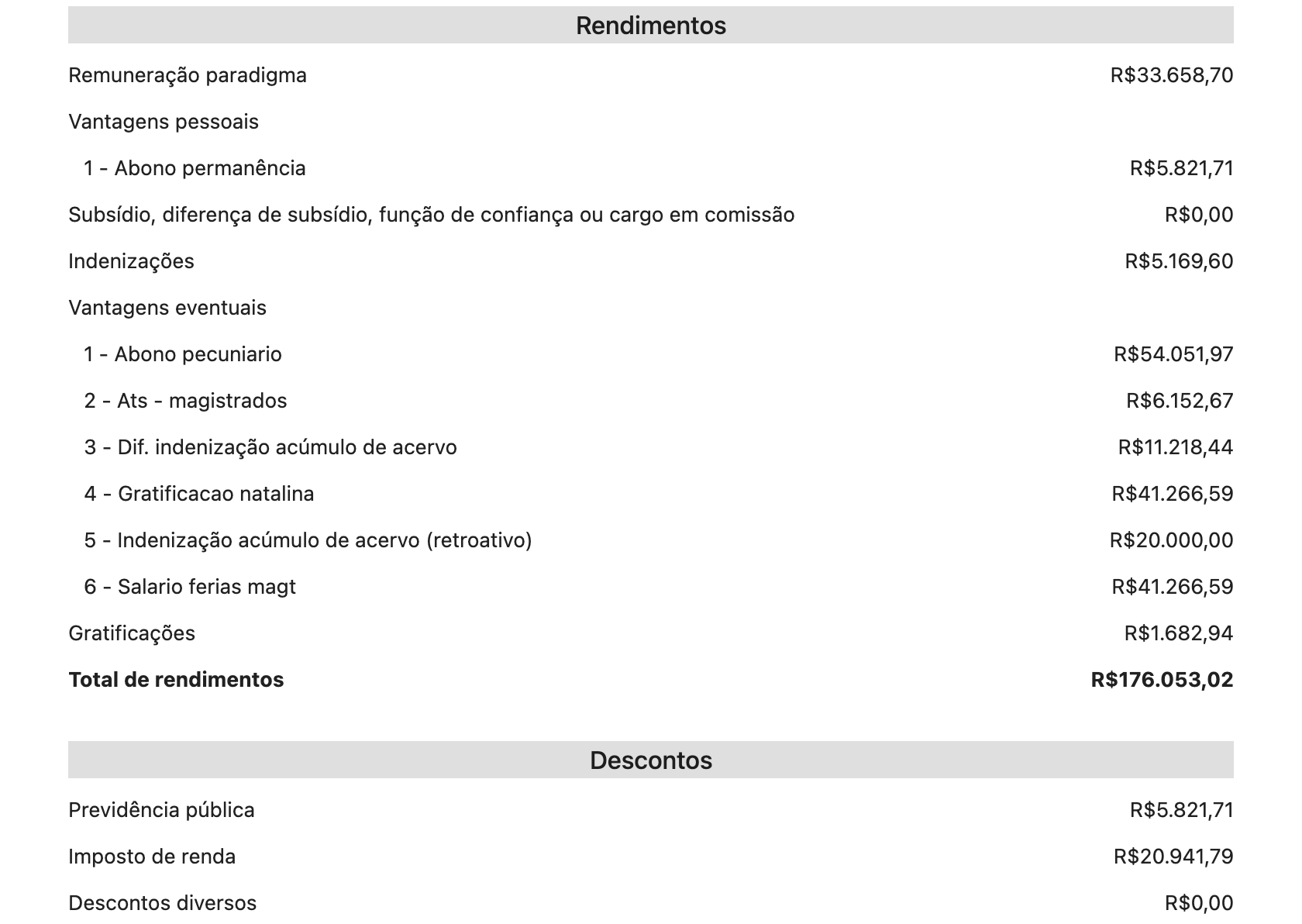 No entanto, os contracheques de desembargadores do TJ-BA apresentam valores expressivamente superiores. Em dezembro de 2025, por exemplo, a faixa de rendimento líquido dos desembargadores variou entre R$ 61.167,11 e impressionantes R$ 178.233,41.