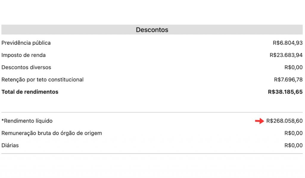 Em dezembro de 2025, por exemplo, o menor rendimento líquido registrado entre desembargadores foi de R$ 61.167,11, enquanto o maior atingiu R$ 268.058,60, que abrangem rendimentos como "abono permanência", "gratificação natalina" e "indenização de férias não usufruídas", sendo, portanto, valores maiores que o teto que deveria vigorar. Parte dessas vantagens eventuais não se enquadra no teto, a exemplo de 13º salário e férias. Todavia, alguns dos chamados "penduricalhos" transformam os vencimentos em supersalários. No mesmo mês, entre juízes de direito, a faixa foi de R$ 65 mil a R$ 185.118,59.
