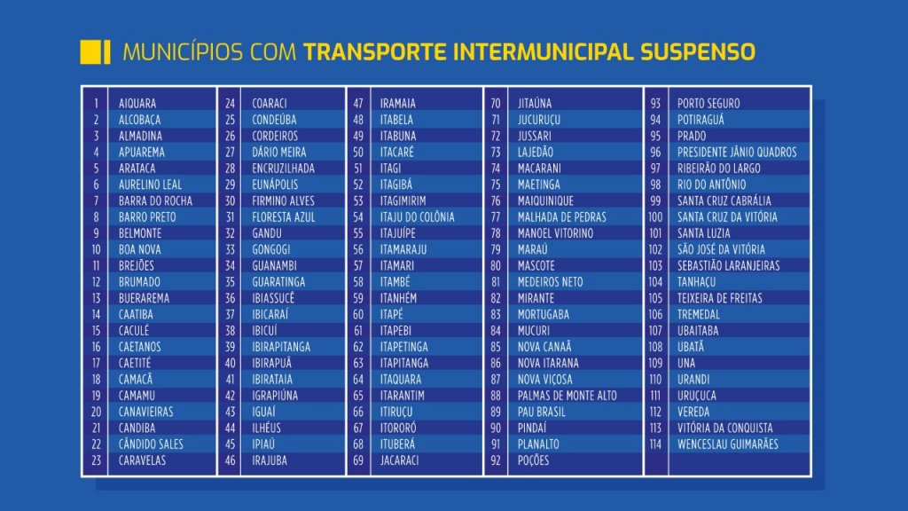 Segundo Rui, nessas cidades as taxas de contaminação e internamento em decorrência da Covid-19 ainda estão em nível alto. Ao todo, 115 cidades continuam com restrição de transporte intermunicipal. Além das citadas, a lista tem Vitória da Conquista, Brumado, Ibicuí, Guanambi, Ipiaú, Maraú, Poções, Prado, Ubatã, Uruçuca, entre outras. Veja abaixo a lista com os 115 municípios ainda com veto de transporte intermunicipal.