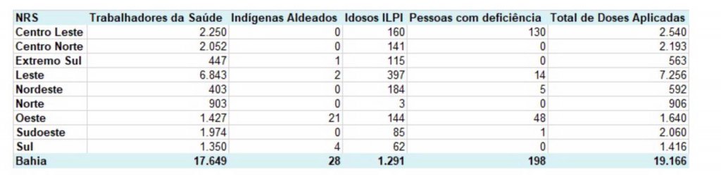 Após o início da vacinação contra a Covid-19 em todo o estado nesta terça-feira (19), algumas cidades aplicaram apenas uma dose do imunizante. A região do Extremo Sul baiano tem o menor contingente de vacinados. Até então, 563 pessoas foram vacinadas. O oposto acontece na região Leste, onde 7.256 cidadãos receberam a primeira doce da vacina, concentrando o maior número.