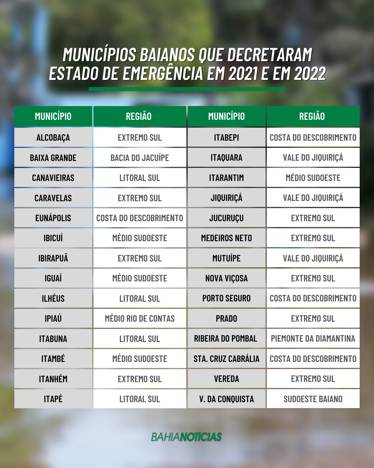 Há municípios que recorrentemente são os mais afetados pelo período de chuvas na Bahia, principalmente os que pertencem à região Sul (Extremo Sul e Litoral Sul). Até o momento, 28 cidades que decretaram estado de emergência no dia 25 de dezembro de 2021 voltaram a determinar urgência por causa dos temporais registrados neste ano. Destas,13 são do trecho sulista da Bahia.