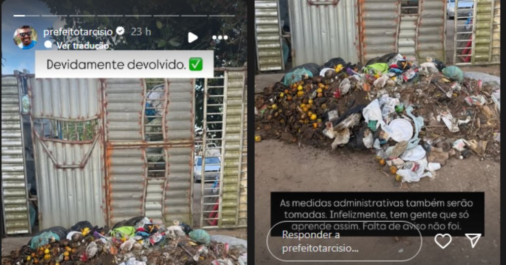 “Vá jogar lixo na casa da desgraça!”, dispara o gestor durante a ação, em seguida o mesmo tira uma foto da fachada do local e posta em seu Instagram. Ainda no vídeo, o próprio prefeito ameaça repetir a medida em outras situações de descarte irregular da cidade.