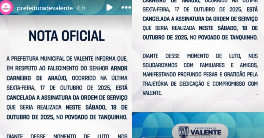 Imagem de nota publicada pela prefeitura de Valente | Foto: Reprodução / Redes Sociais