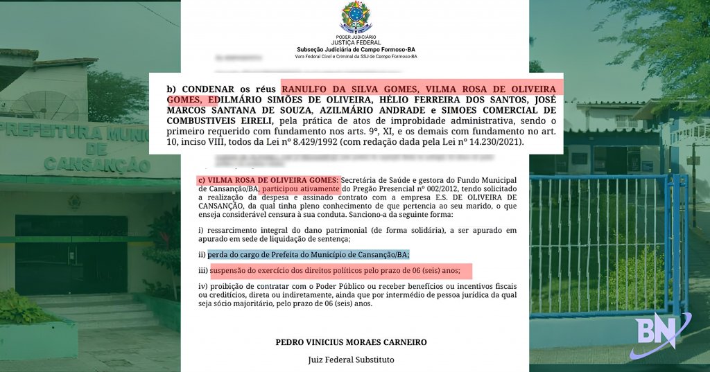 A prefeita de Cansanção, Vilma Gomes (MDB), foi condenada pela Justiça Federal, Subseção Judiciária de Campo Formosoà perda imediata do mandato e à suspensão dos direitos políticos por seis anos. A decisão, proferida na última sexta-feira, (17), refere-se a atos de improbidade administrativa cometidos entre 2011 e 2015, estimado em um valor ultrapassado de R$ 8 milhões.