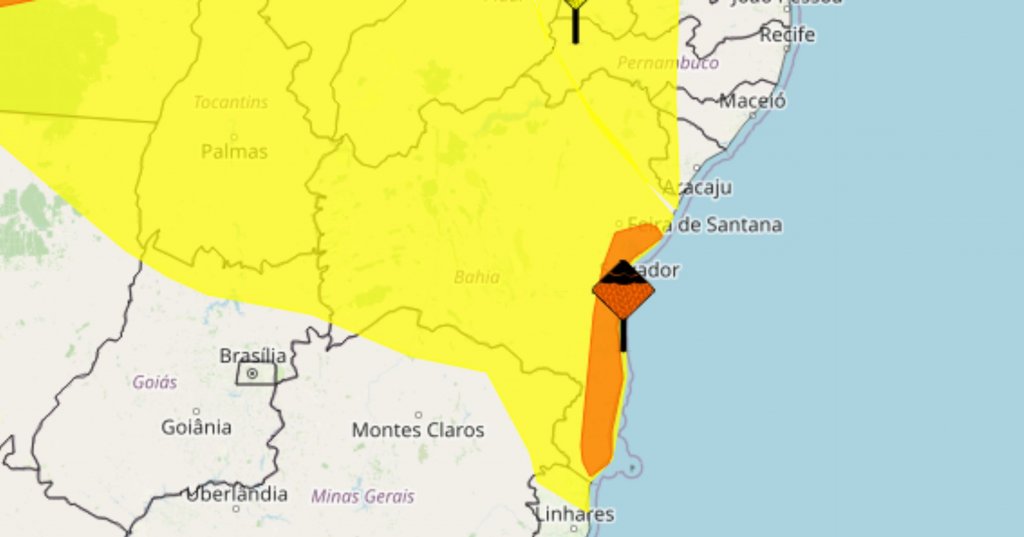 Em conjunto os três alertas seguem desde a costa baiana em cidades como Porto Seguro, Teixeira de Freitas e Cairu (sede de Morro de São Paulo) até no nordeste do estado, como em Uauá e Paulo Afonso. Além de muitas outras até a capital baiana e cidades em torno como Candeias, Madre de Deus e Mata de São João.