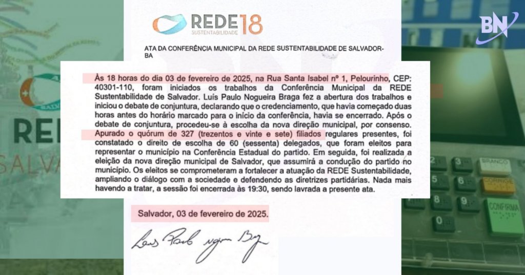 O BN também obteve acesso a uma denúncia movida no âmbito federal por um membro do partido do município de Itabuna. No documento, são citados a direção Nacional do Rede Sustentabilidade (2023-2025) e Respectivos Integrantes da Comissão Eleitoral Nacional (CEN) do VI Congresso Nacional da Rede Sustentabilidade.
