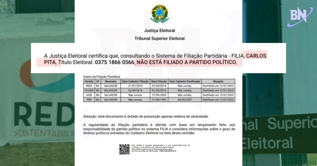 Além da impossibilidade de presença na conferência em fevereiro, também há uma divergência na data de desfiliação. De acordo com a Certidão de Filiação Partidária extraída do sistema FILIA da Justiça Eleitoral, Carlos Pitta só consta como desfiliado em 12 de julho de 2025. A diferença cria um hiato de seis meses entre o falecimento (janeiro) e a baixa oficial no sistema (julho), período durante o qual ele continuou figurando formalmente como membro do partido.