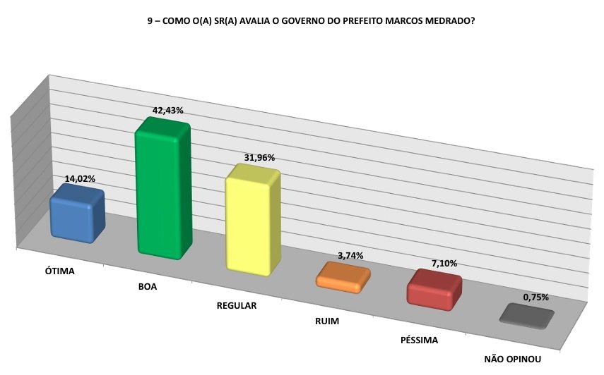 A Séculus também perguntou a moradores como eles avaliam a gestão de Medrado em uma escala de ótimo a péssimo. Com isso, 14,02% disseram ser ótima, 42,43% boa e 31,96% regular. Já 3,74% consideram a gestão ruim e 7,10% péssima. Um percentual de 0,75% não respondeu ou não opinou.
