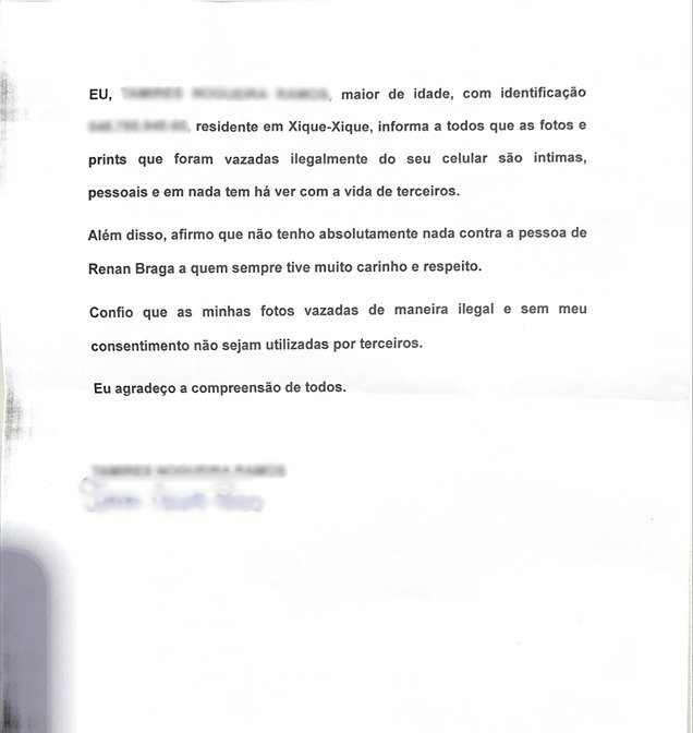 A assessoria do administrador divulgou uma nota em que a própria vitima teria se manifestado contra a divulgação de fotos íntimas dela e afirmado não ter nada contra "a pessoa de Renan Braga". O fato foi registrado nesta quarta-feira (15) na delegacia da cidade. (Atualizado às 9h33)