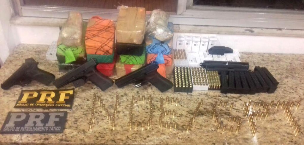Dois homens foram presos em flagrante em um trecho da BR-116 em Vitória da Conquista, no sudoeste, na noite desta quarta-feira (26). Os acusados tentavam transportar armas de fogo, além de drogas e munições. O caso ocorreu na altura do km 830. Segundo a Polícia Rodoviária Federal (PRF-BA), o flagrante ocorreu após abordagem a um veículo GM/Cobalt. Ao fiscalizar o veículo, os policiais encontraram escondidos dois silenciadores de arma de fogo, três pistolas sendo duas de calibre .40 e uma outra de calibre .380, além de 300 munições dentre elas 50 do tipo 9mm. Ainda foram encontrados 12 kg de substância análoga ao crack e 2 kg de substância análoga à cocaína, e mais 300 comprimidos, 3 frascos e 12 ampolas, todos de anabolizantes.