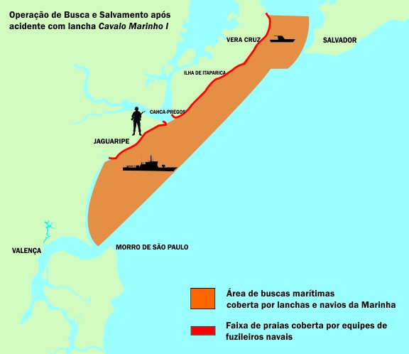 Após realizar, nesta sexta-feira (1º), buscas a uma passageira que está desaparecida após o naufrágio da embarcação Cavalo Marinho I no último dia 24, a Marinha informou que dará continuidade à operação na manhã deste sábado (2). De acordo com o Comando do 2º Distrito Naval (Com2DN), as lanchas da instituição percorrerão a área sul da Baía de Todos-os-Santos. Como há previsão de mar grosso até este sábado, com ondas de até 4,5 metros, não serão feitas buscas em mar aberto. Ainda de acordo com o Com2DN, fuzileiros navais farão a varredura das praias em um trecho de 15 km em direção à região do Baixo Sul, entre a Ponta do Garcia e a foz do rio Jequiriçá, no município de Jaguaripe.