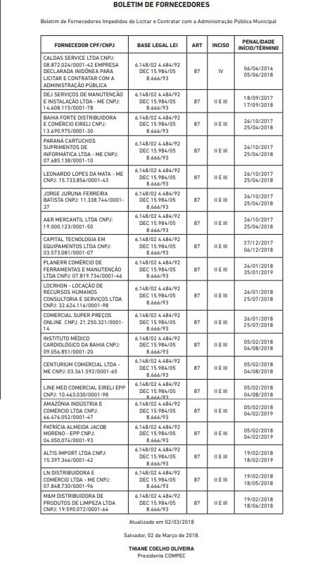 A prefeitura de Salvador divulgou uma lista de 19 empresas proibidas de licitar e contratar com a Administração Pública Municipal, conforme publicação no Diário Oficial do Município (DOM) desta segunda-feira (5). Dentre as fornecedoras impedidas pela prefeitura, está o Instituto Médico Cardiológico da Bahia (Imcba), alvo da Operação Corpénico, e Altis Import Comercial, da Operação Aleteia. Confira a lista completa abaixo: