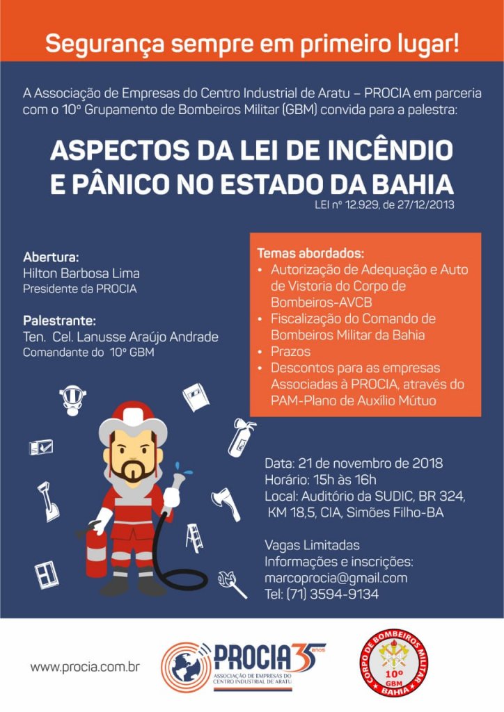 A Associação de Empresas do Centro Industrial de Aratu (Procia), em parceria com o 10º Grupamento de Bombeiros Militar (GBM), realizam a palestra “Aspectos da Lei de Incêndio e Pânico no Estado da Bahia”, no próximo dia 21, das 15h às 16h, no auditório da Sudic, BR 324, KM 18,5, CIA, em Simões Filho.