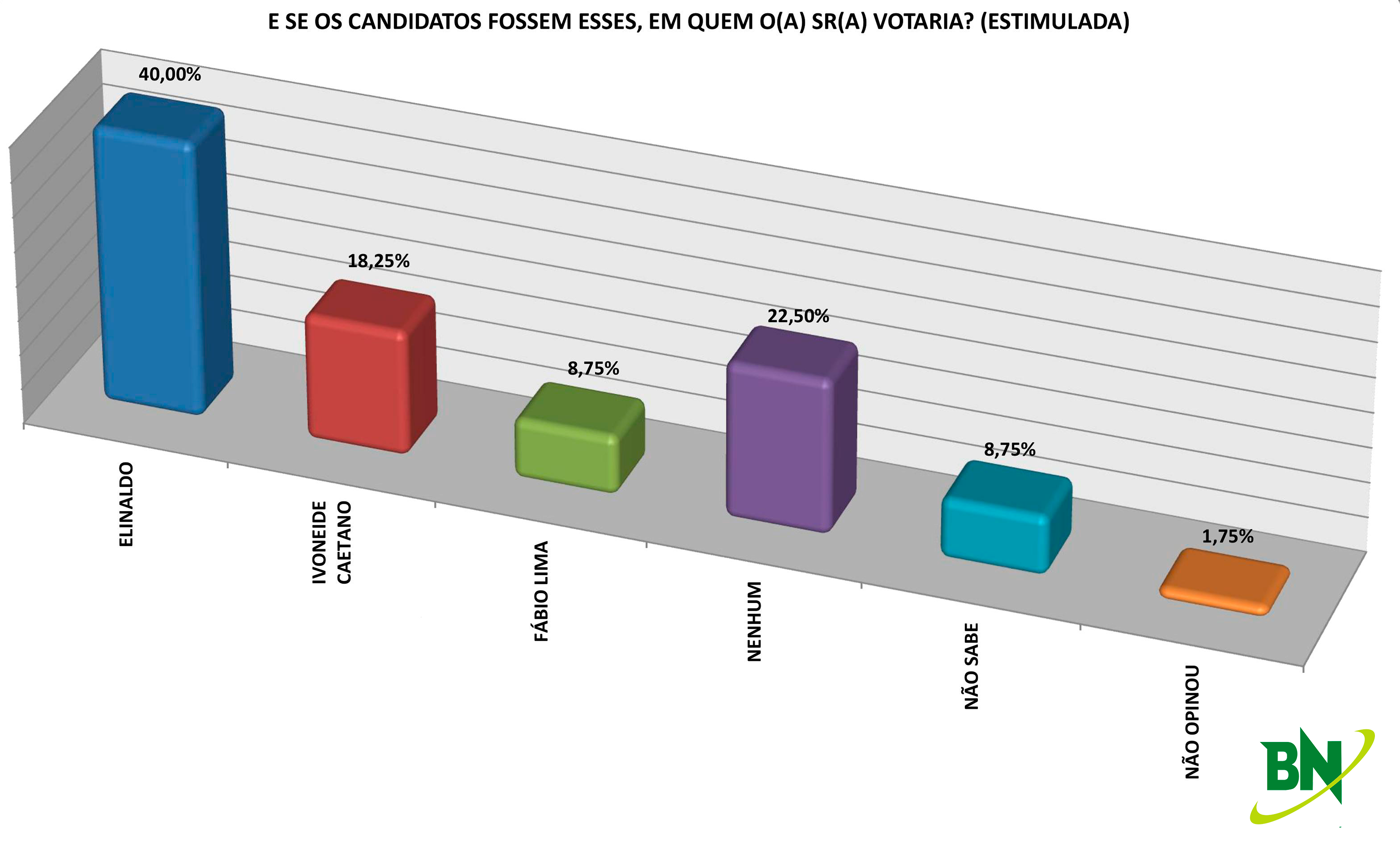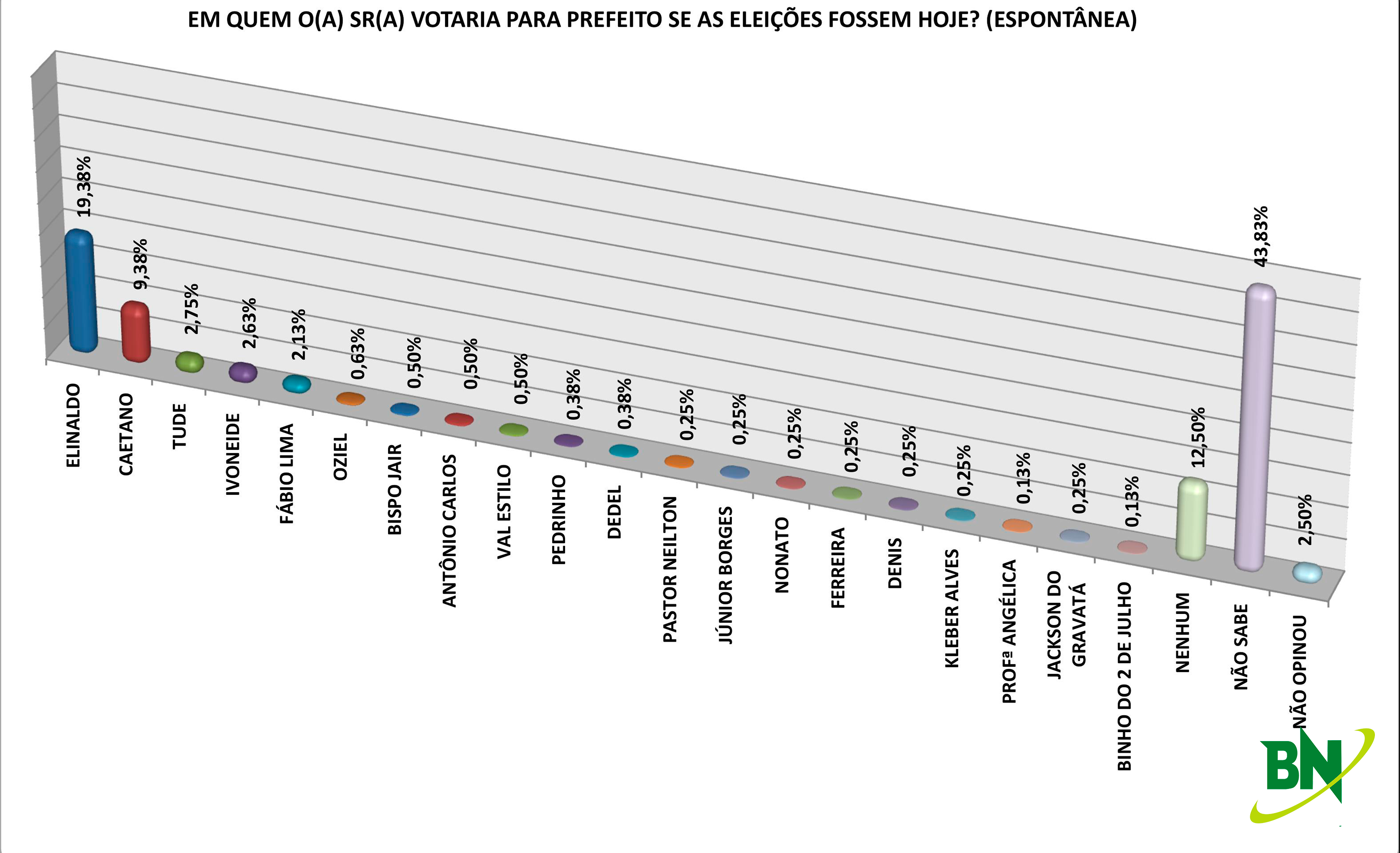Quando o cenário é espontâneo, em que não são apresentados nomes de candidatos aos eleitores, 20 nomes foram citados. Elinaldo também aparece na liderança com 19,38%, seguido de Caetano (9,38%), Tude (2,75%), Ivoneide (2,63%) e Fábio Lima (2,13%). Os nomes restantes pontuaram menos de 1%.
